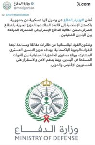 سعودی عرب(بولونیوز)سعودی وزارتِ دفاع نے اعلان کیا ہے کہ پاک-سعودی دفاعی معاہدے کے تحت پاکستانی دستے کنگ عبدالعزیز بیس پر تعینات کر دیے گئے ہیں، جن میں طیارے اور معاون سپورٹنگ یونٹس شامل ہیں۔ اعلامیے کے مطابق اس تعیناتی کا مقصد خطے میں دفاعی تعاون کو مضبوط بنانا اور علاقائی و عالمی امن کے فروغ…