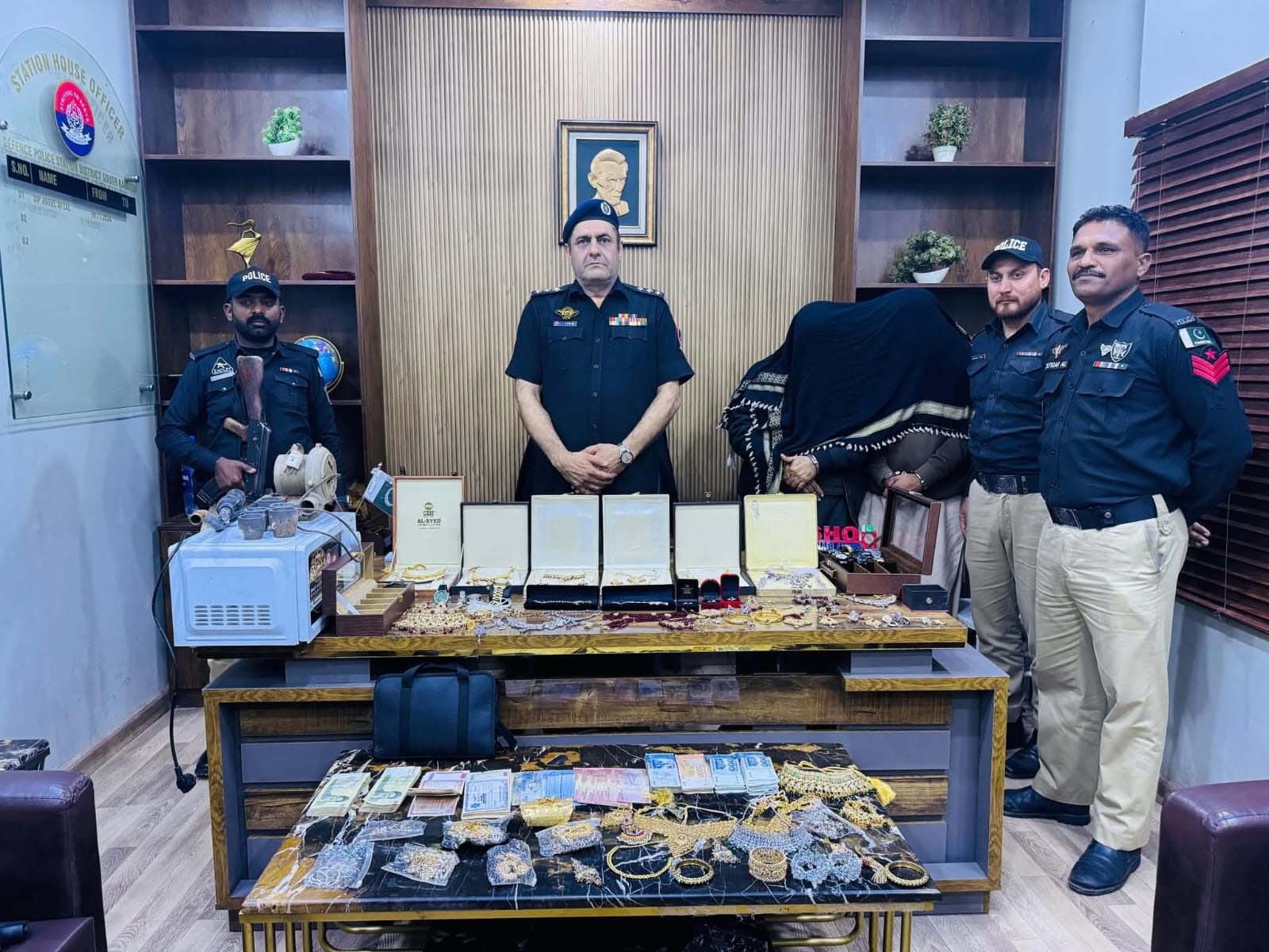 برآمد ہونے والے سامان میں چار عدد 30 بور اور 9 ایم ایم پستول، 7 لاکھ روپے نقد، 1800 درہم، 2000 ریال، 140 امریکی ڈالر، 36 عدد 200 روپے والے اور 13 عدد 100 روپے والے پرائز بانڈ، پانچ سیٹ طلائی زیورات، آٹھ سونے کی انگوٹھیاں، سونا پگھلانے کا سامان، تقریباً دو کلو آرٹیفیشل زیورات، ایک مائیکروویو اوون اور 20 قیمتی گھڑیاں بمعہ باکس شامل ہیں۔
