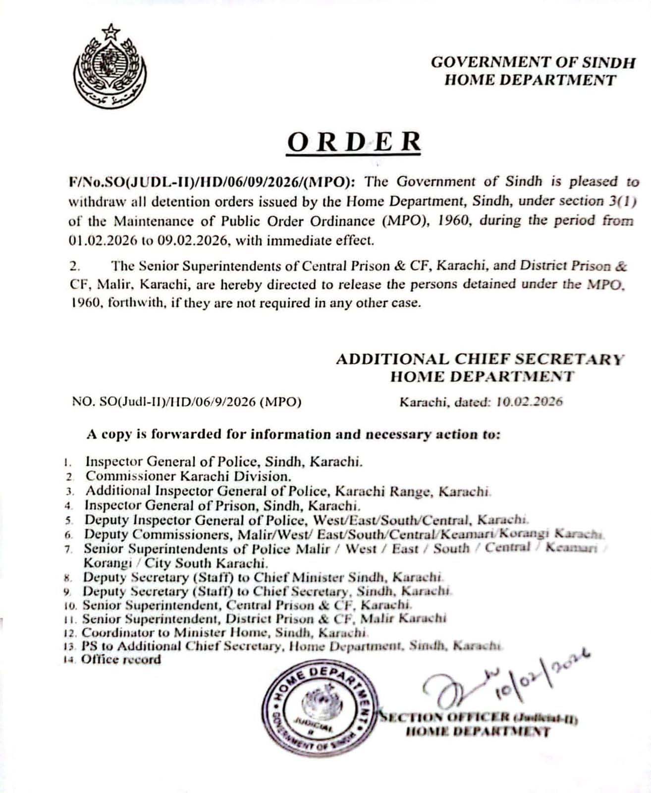 کراچی(بولونیوز)سندھ حکومت نے اہم فیصلہ کرتے ہوئے ایم پی او (Maintenance of Public Order) کے تحت 01 سے 09 فروری 2026 کے دوران جاری ہونے والے تمام حراستی احکامات فوری طور پر ختم کر دیے ہیں۔