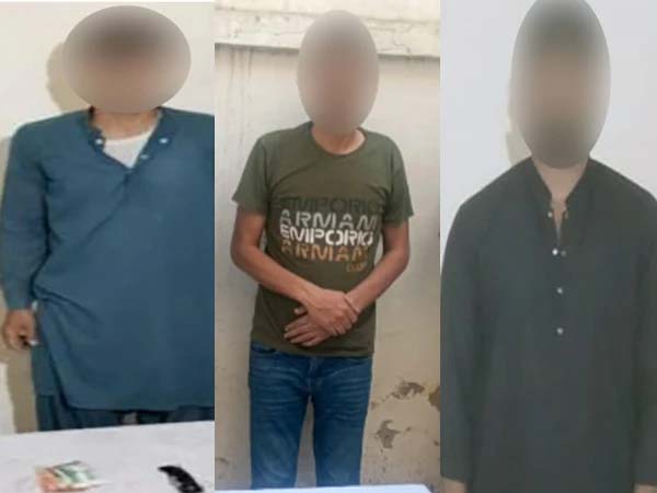 گرفتار ملزمان کی شناخت نعیم عرف مولا ولد شیر بہادر، شاہزیب عرف شاہ جی ولد نعیم شاد اور عامر خان ولد امان اللہ کے ناموں سے ہوئی ہے۔ رینجرز کے مطابق گرفتار ملزمان کے قبضے سے دو عدد بغیر لائسنس پسٹل بمعہ ایمونیشن، ایک بوتل شراب، دو گرام حشیش، ایک عدد خنجر، ایک عدد چوری شدہ موٹرسائیکل، موبائل فون اور نقدی برآمد کر لی گئی۔