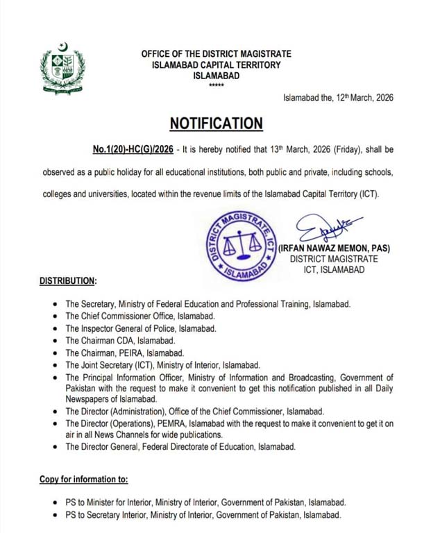 اسلام آباد(بولونیوز)ڈسٹرکٹ مجسٹریٹ عرفان نواز میمن کی جانب سے جاری کردہ نوٹیفکیشن کے مطابق 13 مارچ 2026 بروز جمعہ کو اسلام آباد کی حدود میں واقع تمام تعلیمی ادارے بند رہیں گے۔