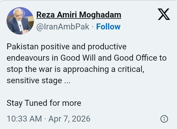 واضح رہے کہ پاکستان نے امریکا اور ایران کے درمیان جنگ بندی کے لیے ثالثی کا کردار ادا کیا ہے۔ پاکستان نے ایک دو مرحلوں پر مبنی جنگ بندی کا فریم ورک ایران اور امریکا دونوں کو پیش کیا، جسے ’اسلام آباد معاہدہ‘ کہا جا رہا ہے۔ ایران نے اس کے بدلے میں مستقل جنگ بندی اور امن حل کی جانب بڑھنے پر زور دیا ہے۔