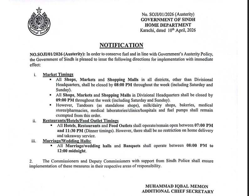 سندھ میں کفایت شعاری پالیسی نافذ، مارکیٹس اور شاپنگ مالز کے اوقات کار تبدیل