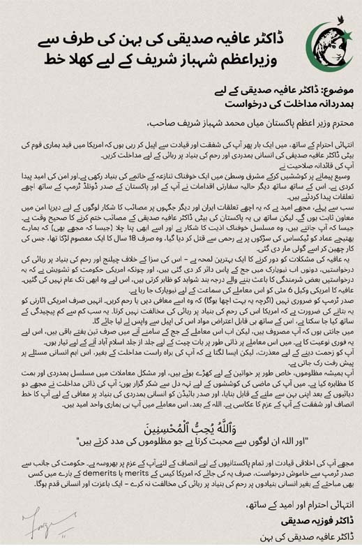 عافیہ صدیقی کی بہن نے وزیراعظم شہباز شریف اور چیف آف آرمی اسٹاف جنرل عاصم منیر سے مطالبہ کیا ہے کہ وہ اسلام آباد میں ہونے والے مذاکرات میں عافیہ صدیقی کی رہائی کو ترجیحی بنیادوں پر شامل کریں۔