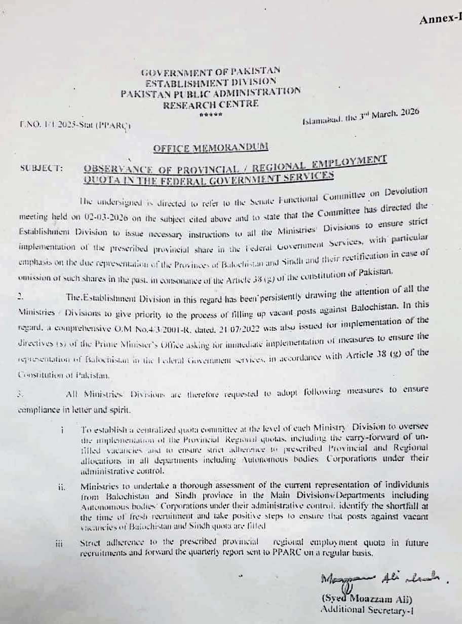 اسٹیبلشمنٹ ڈویژن نے خالی آسامیوں پر بلوچستان اور سندھ سے تعلق رکھنے والے امیدواروں کو ترجیح دینے کا حکم بھی جاری کیا ہے۔ اس کے ساتھ ساتھ خودمختار اداروں اور سرکاری کارپوریشنز میں بھی صوبائی کوٹہ پر عملدرآمد کو لازم قرار دیا گیا ہے۔
