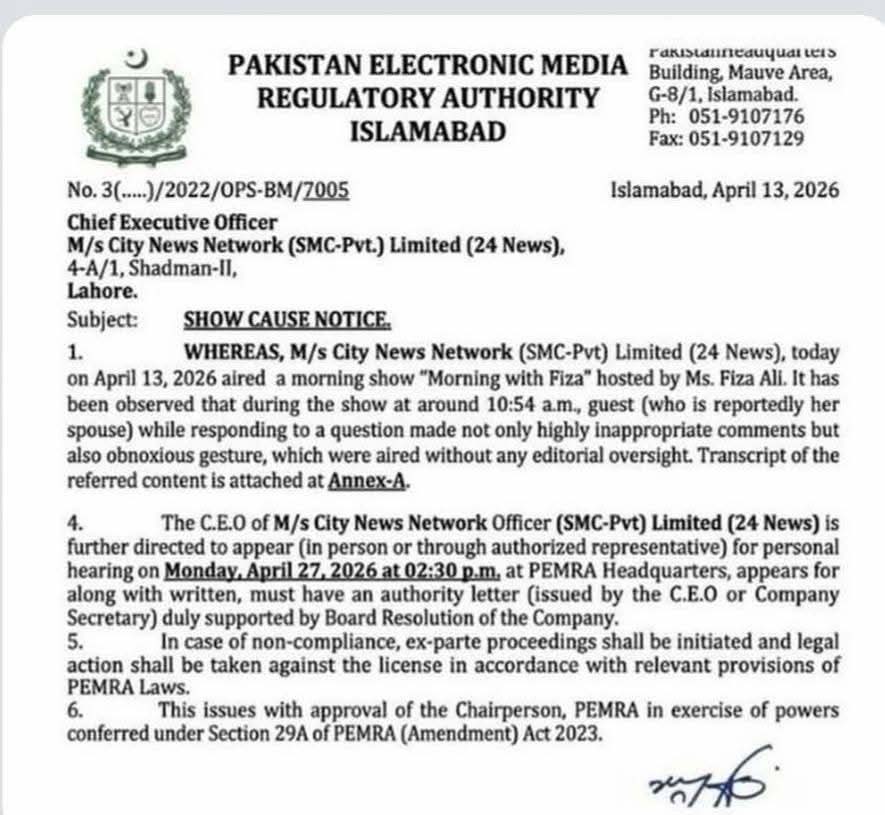 پیمرا کا نجی ٹی وی چینل 24 نیوز کو شوکاز نوٹس، متنازعہ مارننگ شو کلپ پر کارروائی