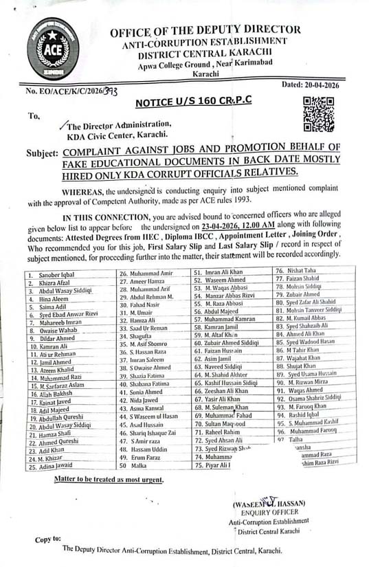 کراچی(بولونیوز)کراچی ڈیولپمنٹ اتھارٹی (کے ڈی اے) میں بڑے پیمانے پر غیر قانونی بھرتیوں اور جعلی تعلیمی اسناد کے الزامات پر اینٹی کرپشن اسٹیبلشمنٹ نے کارروائی تیز کر دی ہے۔ اینٹی کرپشن ڈسٹرکٹ سینٹرل کی جانب سے جاری نوٹس کے مطابق 100 افسران اور ملازمین کو آج تمام متعلقہ ریکارڈ کے ہمراہ طلب کر لیا گیا ہے۔