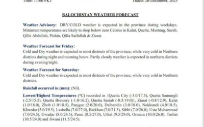 کوئٹہ(بولونیوز)علاقائی موسمیاتی مرکز بلوچستان کے مطابق آئندہ دنوں کے دوران صوبے کے بیشتر اضلاع میں موسم خشک اور سرد رہنے کا امکان ہے، جبکہ شمالی اضلاع میں رات اور صبح کے اوقات میں شدید سردی میں اضافہ ہوگا۔ محکمہ موسمیات کے مطابق قلات، کوئٹہ، مستونگ، سوراب، قلعہ عبداللہ، پشین، قلعہ سیف اللہ اور زیارت میں…